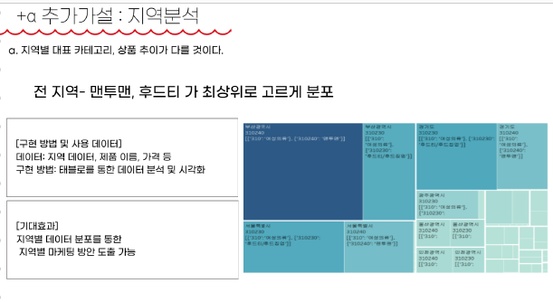 - 카테고리>브랜드>키워드 상위 판매(데이터 적고), 관심도(데이터 많아서 근거치가 많고) 를 나타탄다. ⇒ 판매자에게는 지역 제품 추천(카테고리>브랜드>키워드) , 지역별 특산품