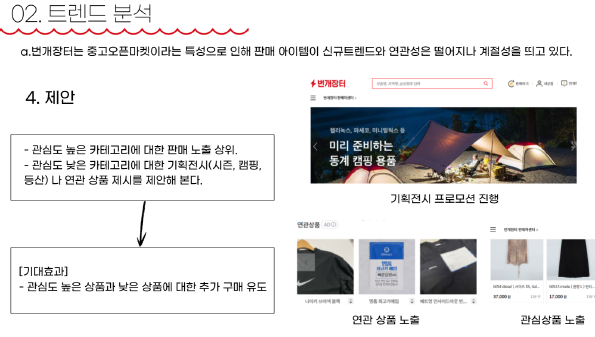 - 예) 수, 목요일 : 주말에 입을 옷을 찾고 있나요? 원피스 리스트 보기 / 주말: 출근룩을 찾고 있나요? 셔츠 보기상품 분석