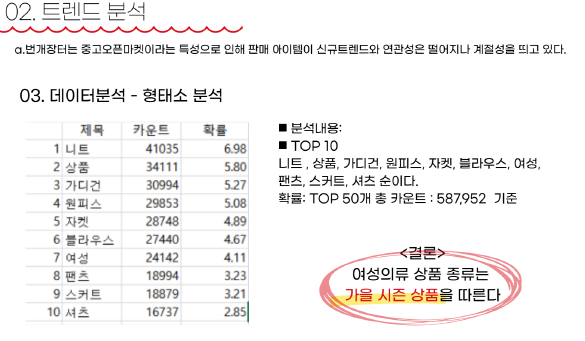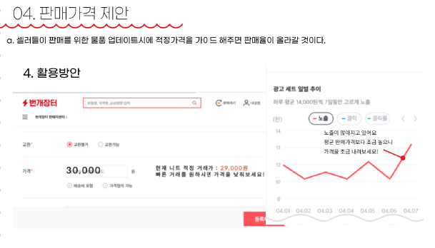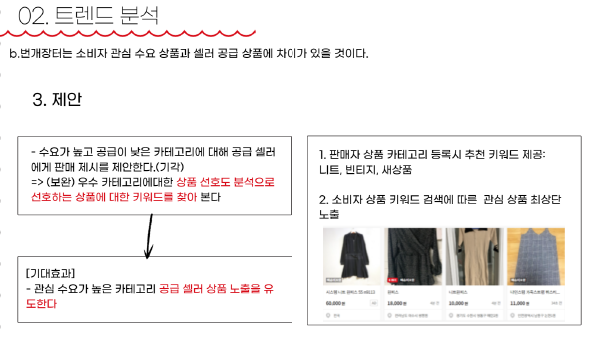- 마케팅 제안 ( 예를들어, 니트는 25,000원이 평균가이고 **님이 올리신 가격은 살짝 높습니다. 가격을 10% 낮추시면 판매율이 40%가 향상됩니다. )
