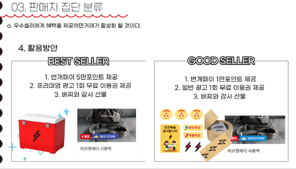- 광고를 달거나, 번개페이, 안팔리는 제품 판매(기획전)